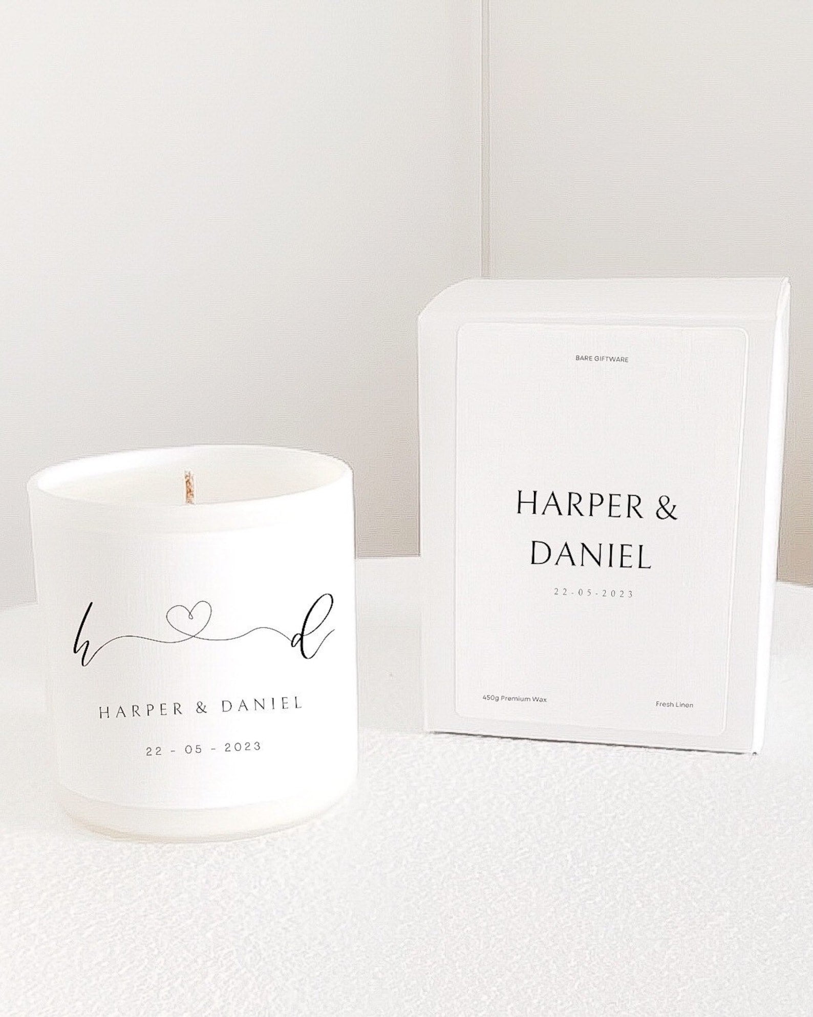 Introducing our gorgeous personalised scented candle – a masterpiece of elegance and sentiment. Each candle is adorned with the couple's initials and the memorable event date, meticulously printed on a lavish linen-textured label.