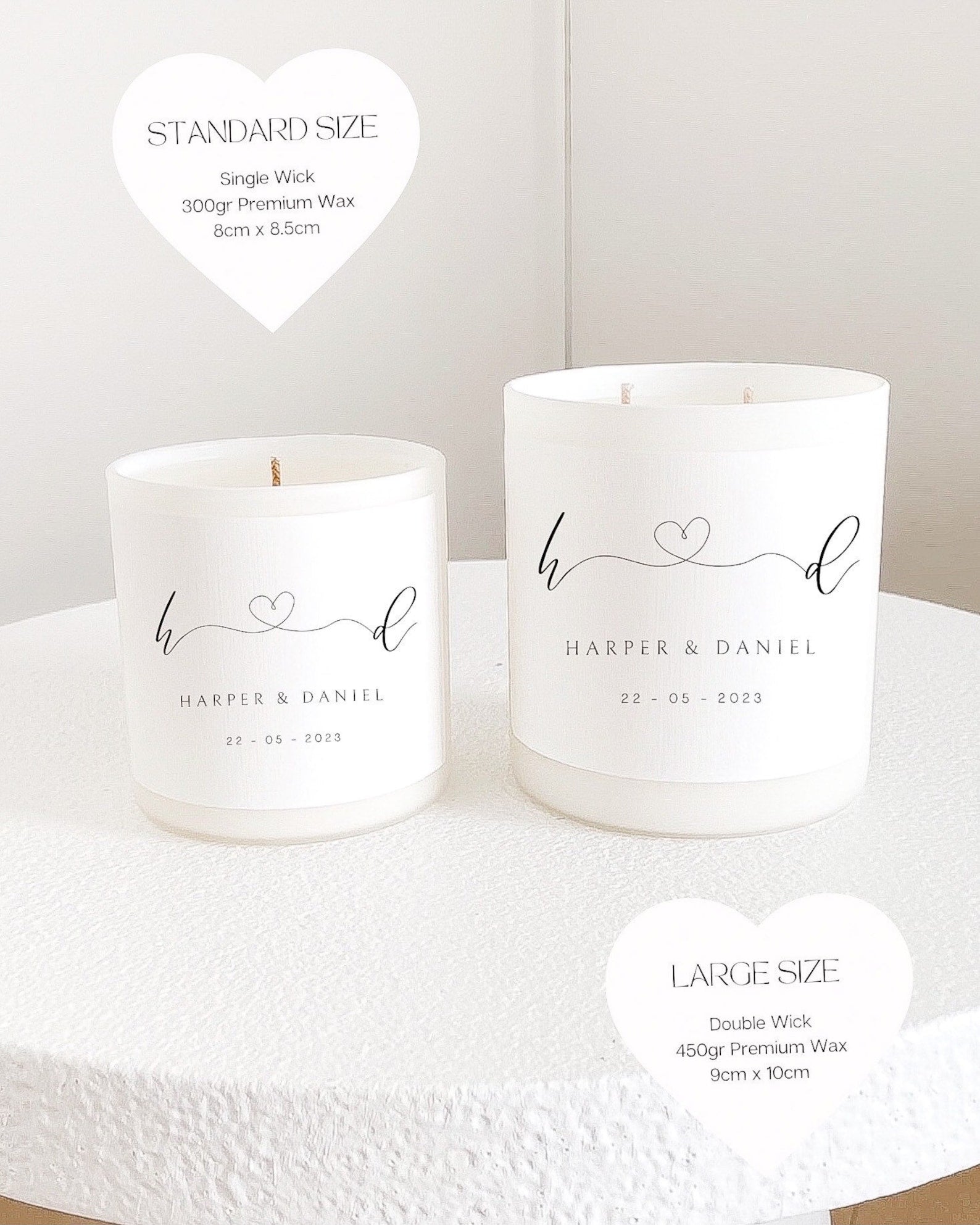 This candle is more than just a gift, it's a cherished keepsake that captures the essence of a special moment. Available in two sizes and offering a choice of five captivating scents, you can tailor this candle to create a truly personalized and unforgettable gift.